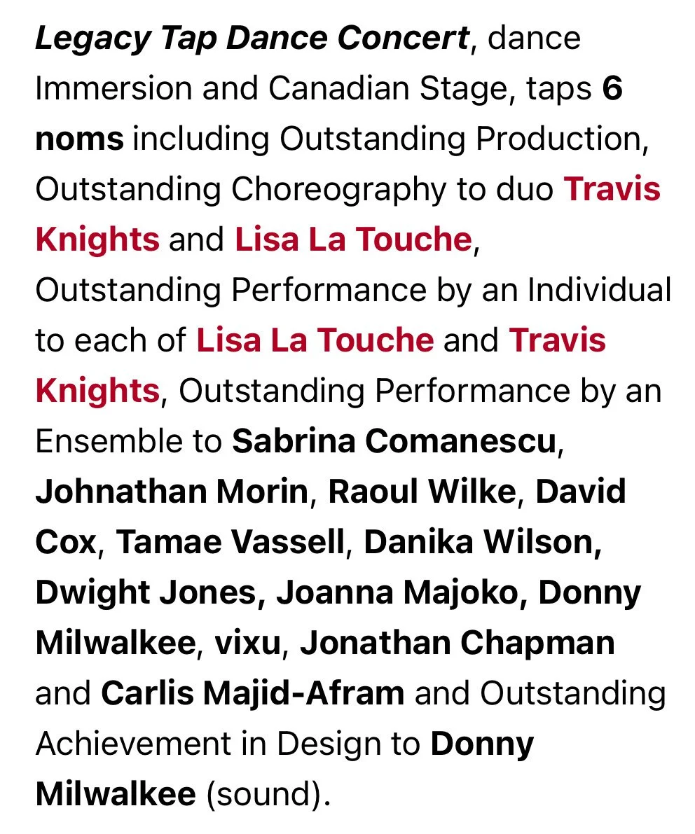 Lisa La Touche receive nominations for Outstanding Choreography and Outstanding Performance by an Individual.
